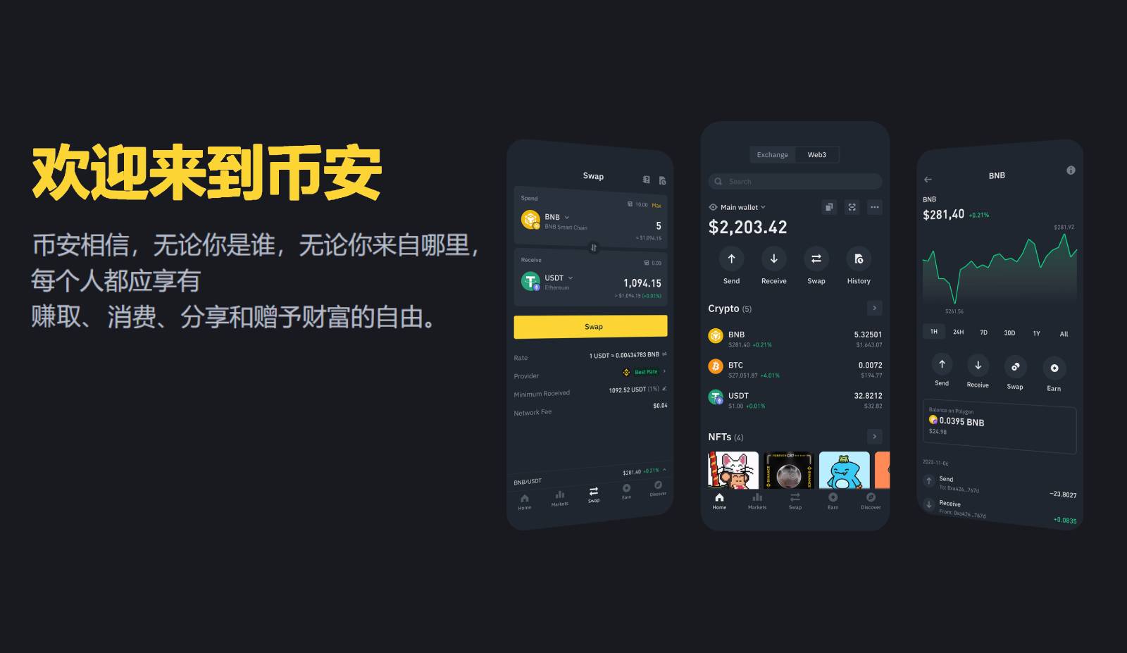 币 安app下载最新版本是全球最大的区块链资产交易平台,由赵长鹏创立于2017年。其总部位于马耳他,服务全球200多个国家和地区的用户。提供多币种、多语言的币币兑换服务,包含BinanceInfo,BinanceLabs,BinanceLaunchpad等业务。还提供借贷、期货和期权、加密钱包等服务。核心成员来自知名企业,是精英团队。有多层次安全保障机制,能抵御DDOS攻击,确保安全稳定。